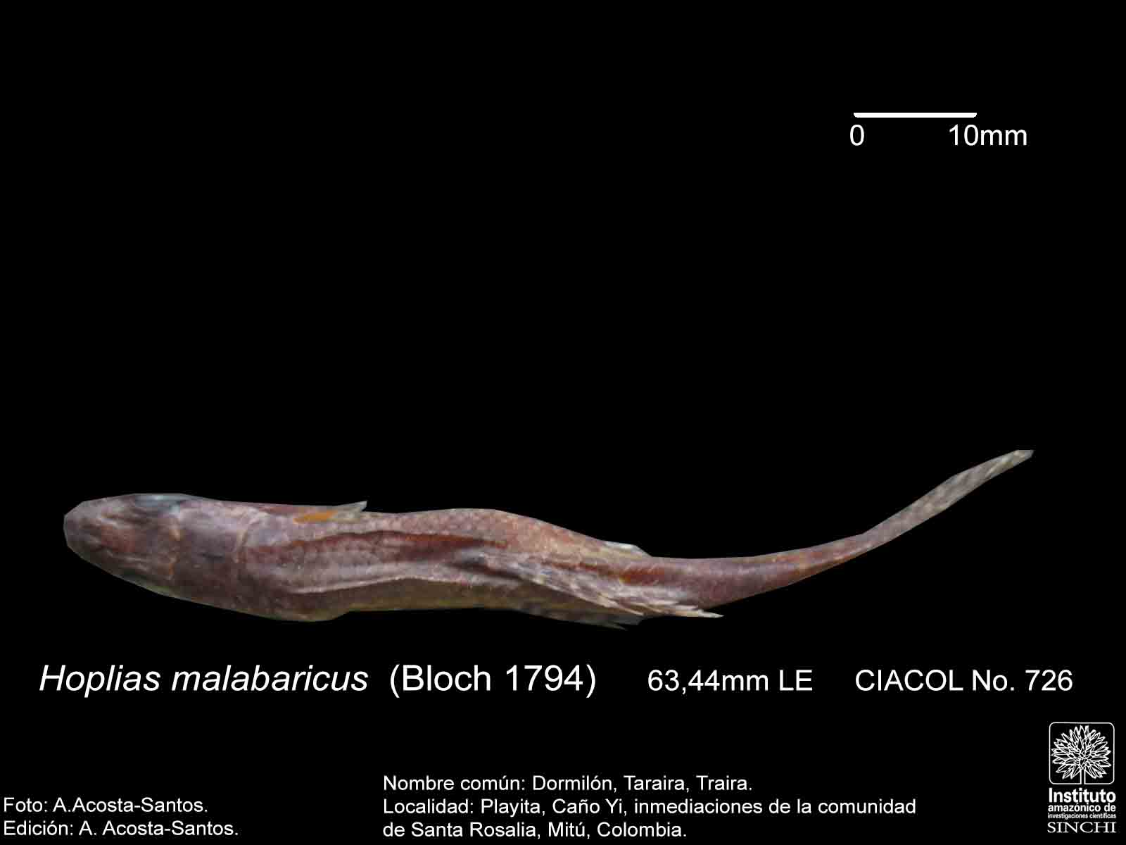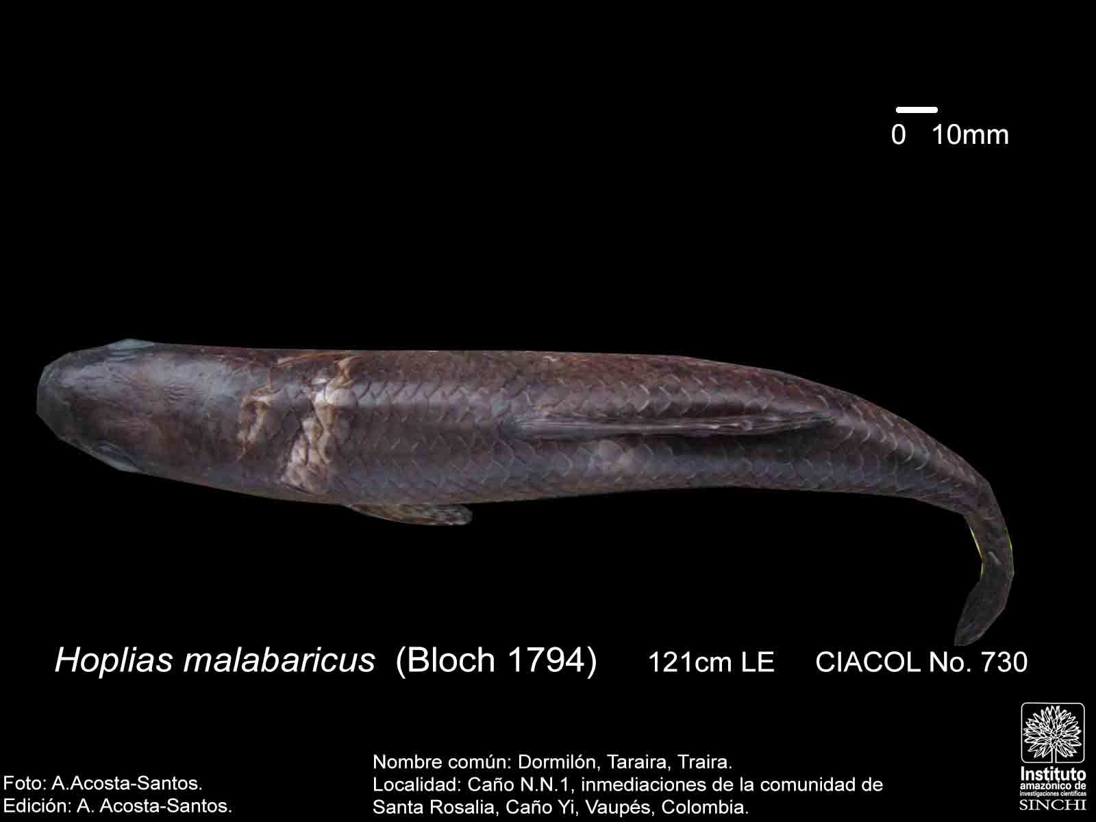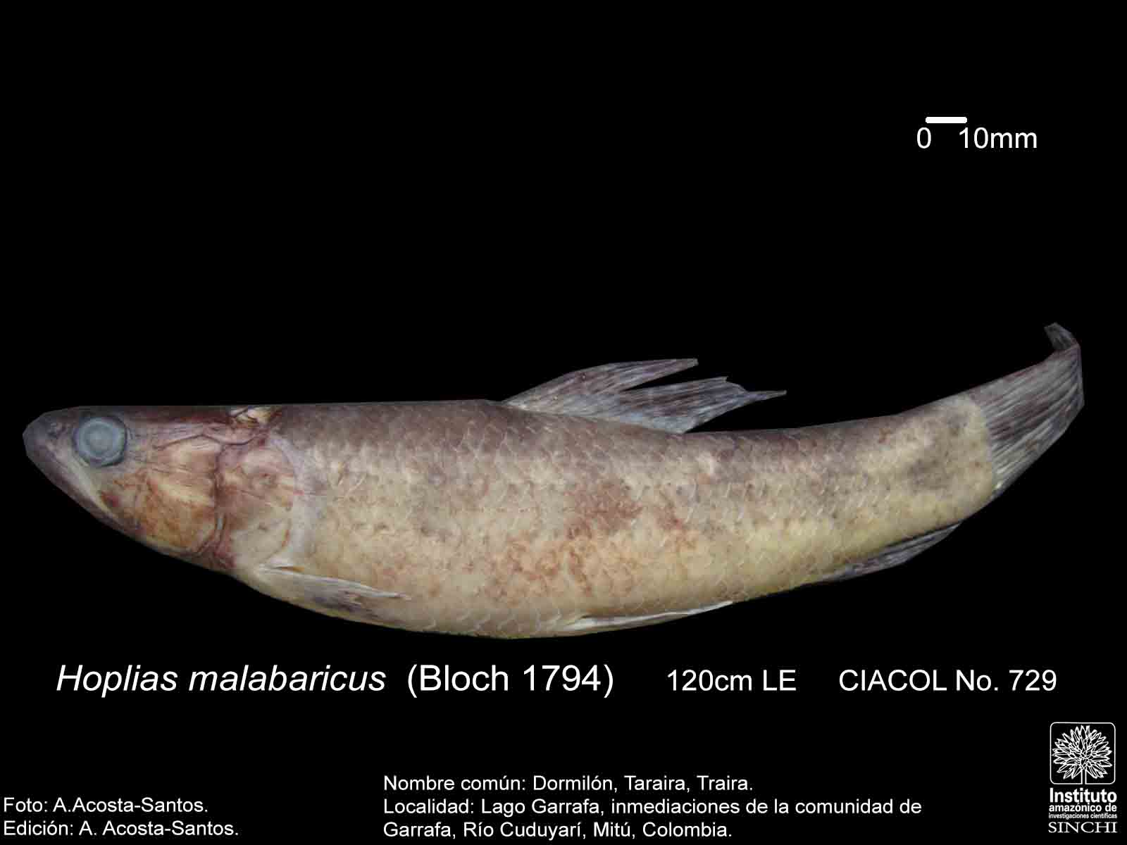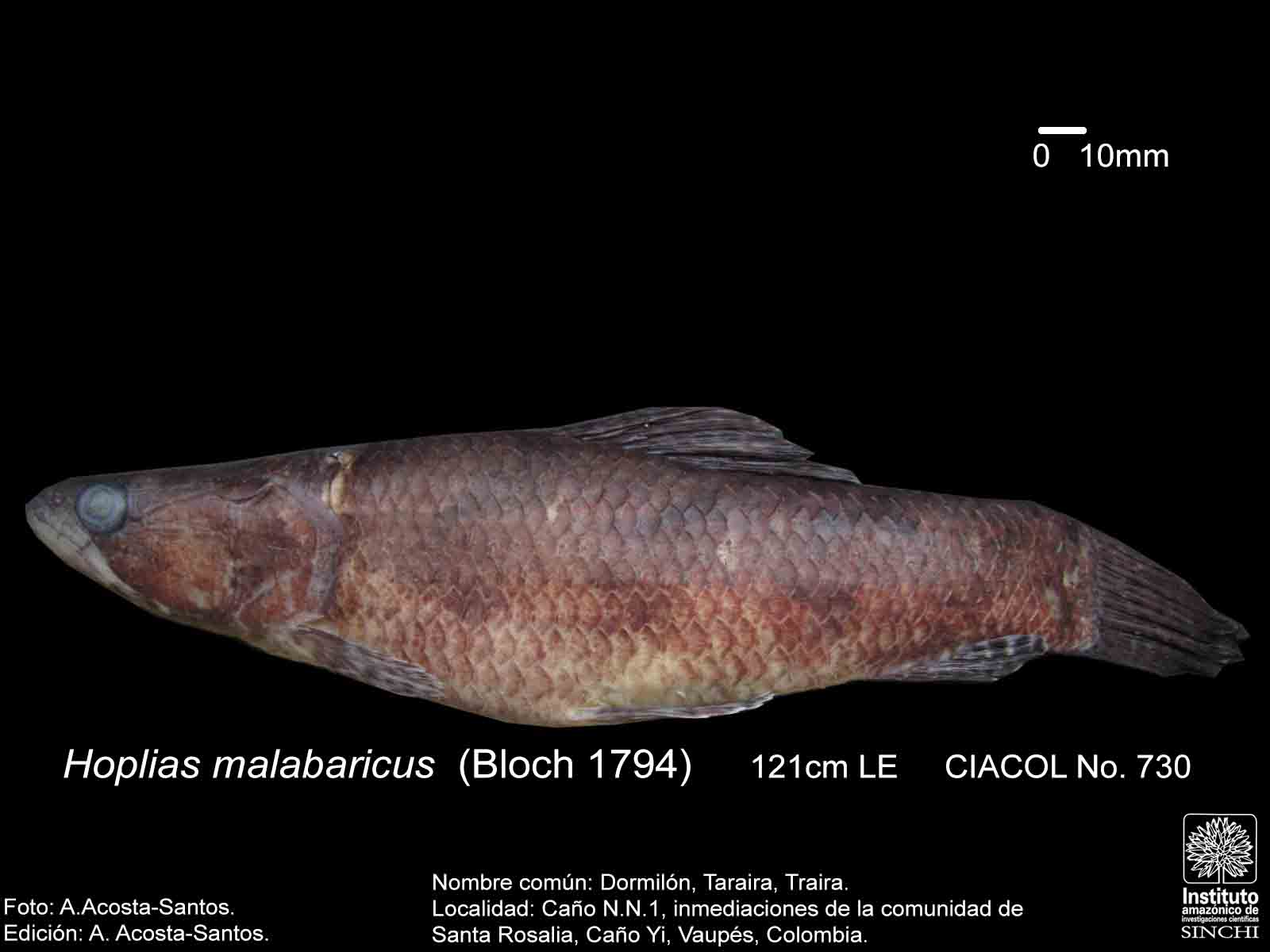 Dormilón, Moncholo, Guabina (ríos Guaviare, Negro, Caquetá, Venezuela), Taraira, Traíra (Vaupés, Amazonas, Brasil), Bentón (Bolivia), Huasaco (Perú) (Salinas & Agúdelo, 2000:44, De Melo, C., et al 2005:91, Galvis, G. et al 2006:106, Santos, G. et al 2006:65). |