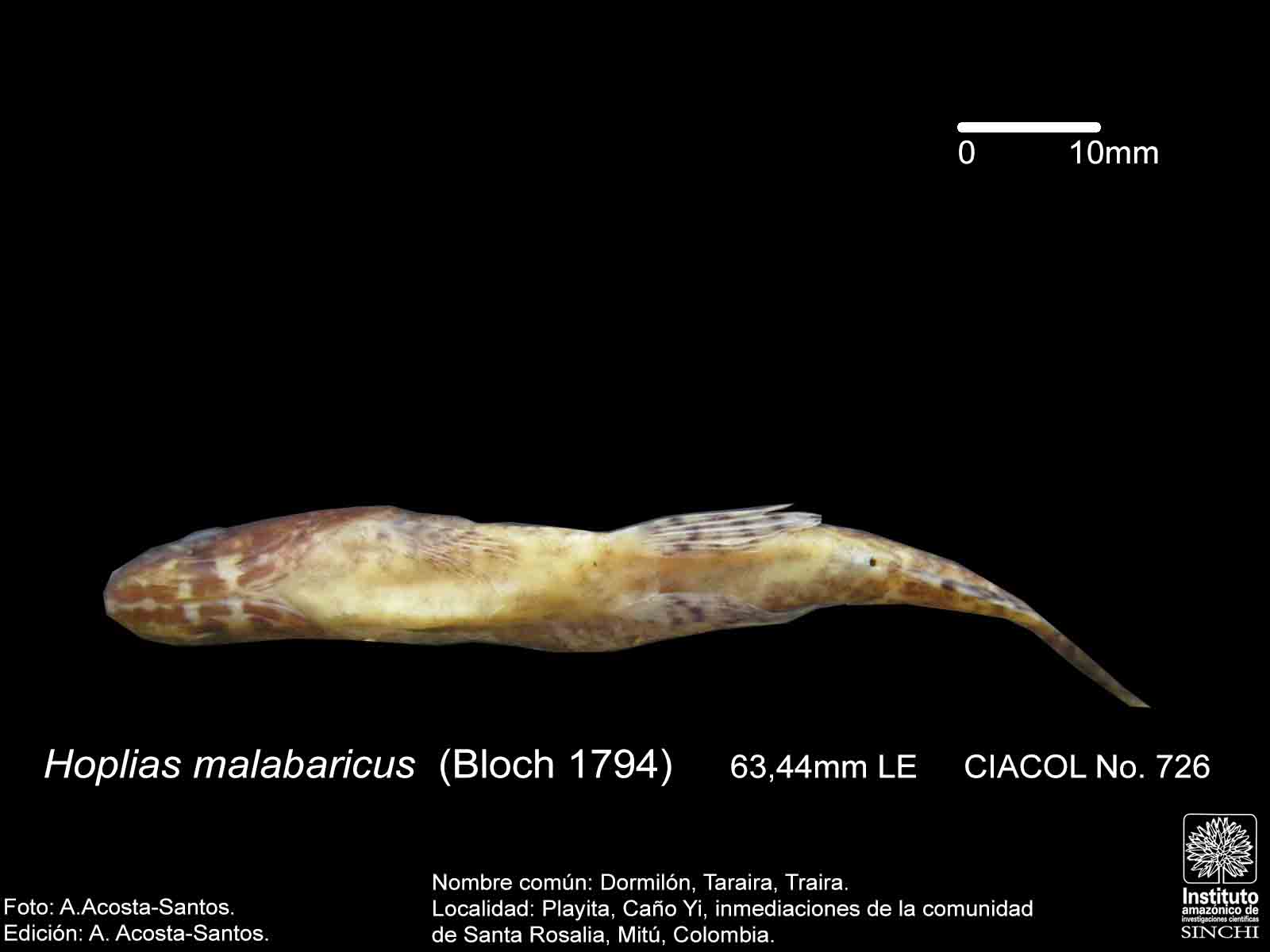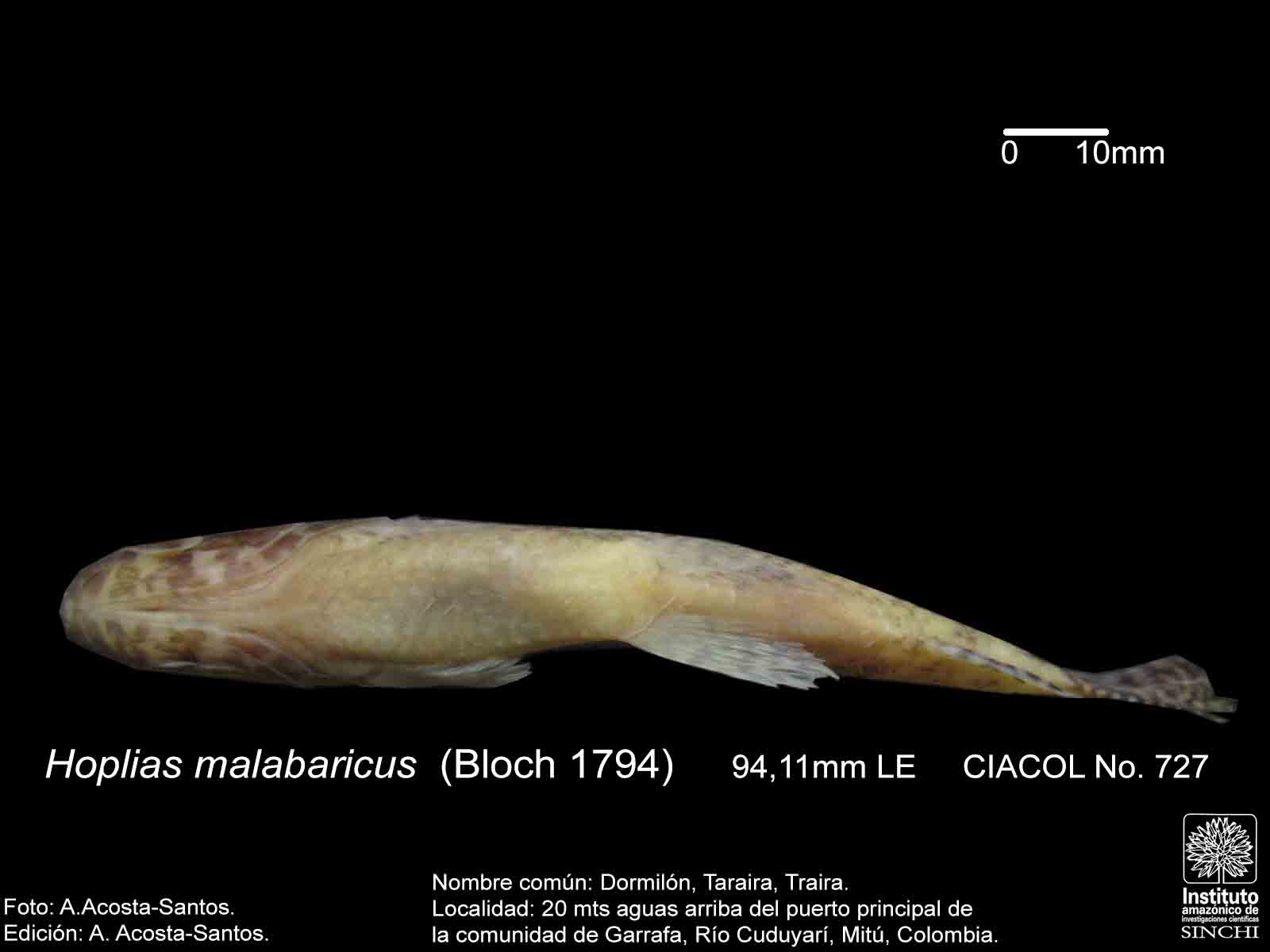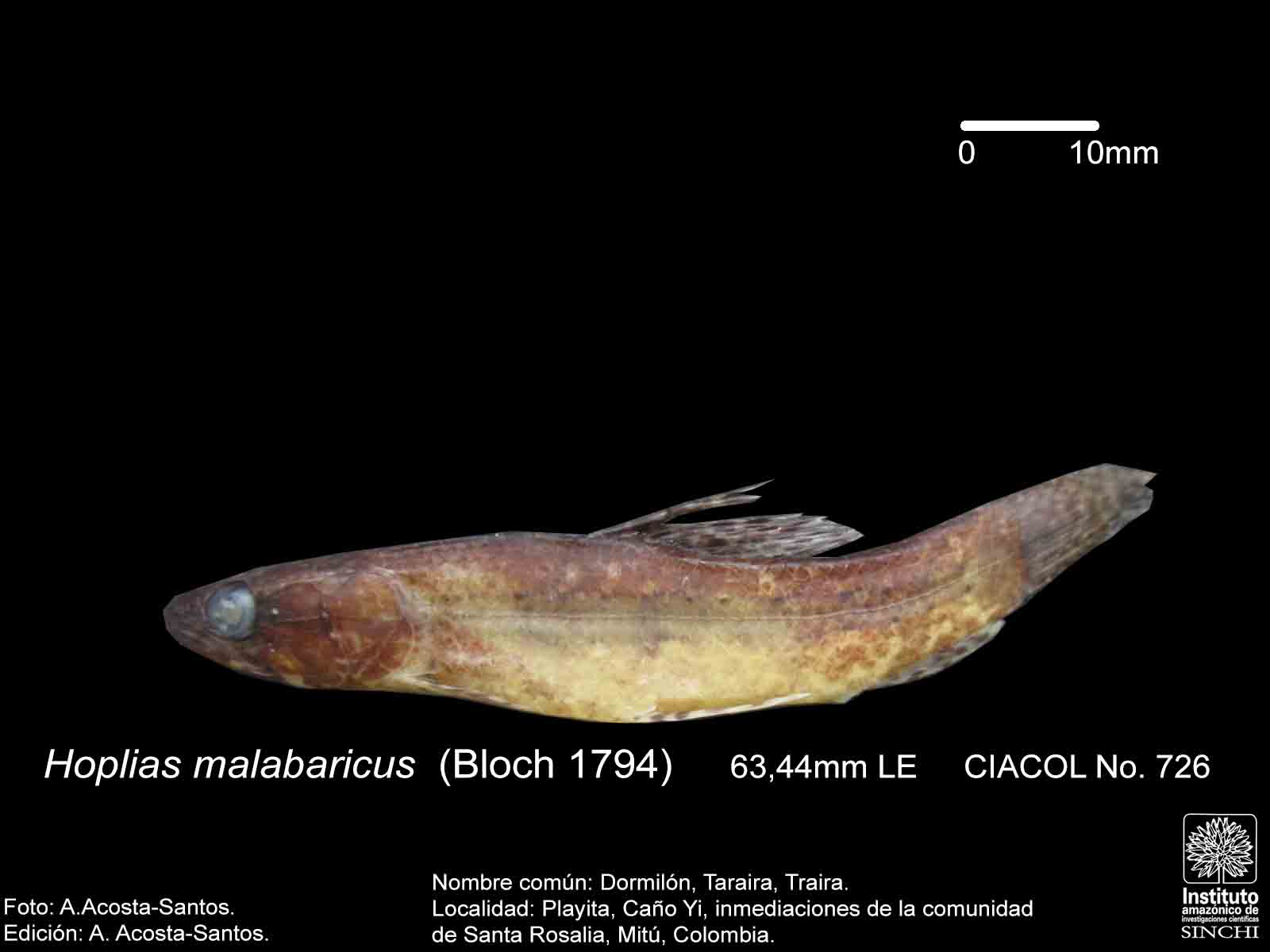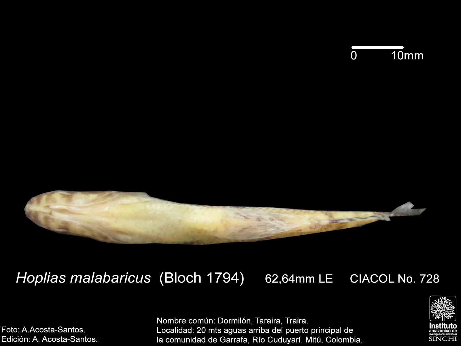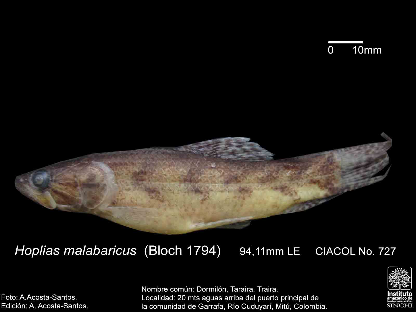Dormilón, Moncholo, Guabina (ríos Guaviare, Negro, Caquetá, Venezuela), Taraira, Traíra (Vaupés, Amazonas, Brasil), Bentón (Bolivia), Huasaco (Perú) (Salinas & Agúdelo, 2000:44, De Melo, C., et al 2005:91, Galvis, G. et al 2006:106, Santos, G. et al 2006:65). |