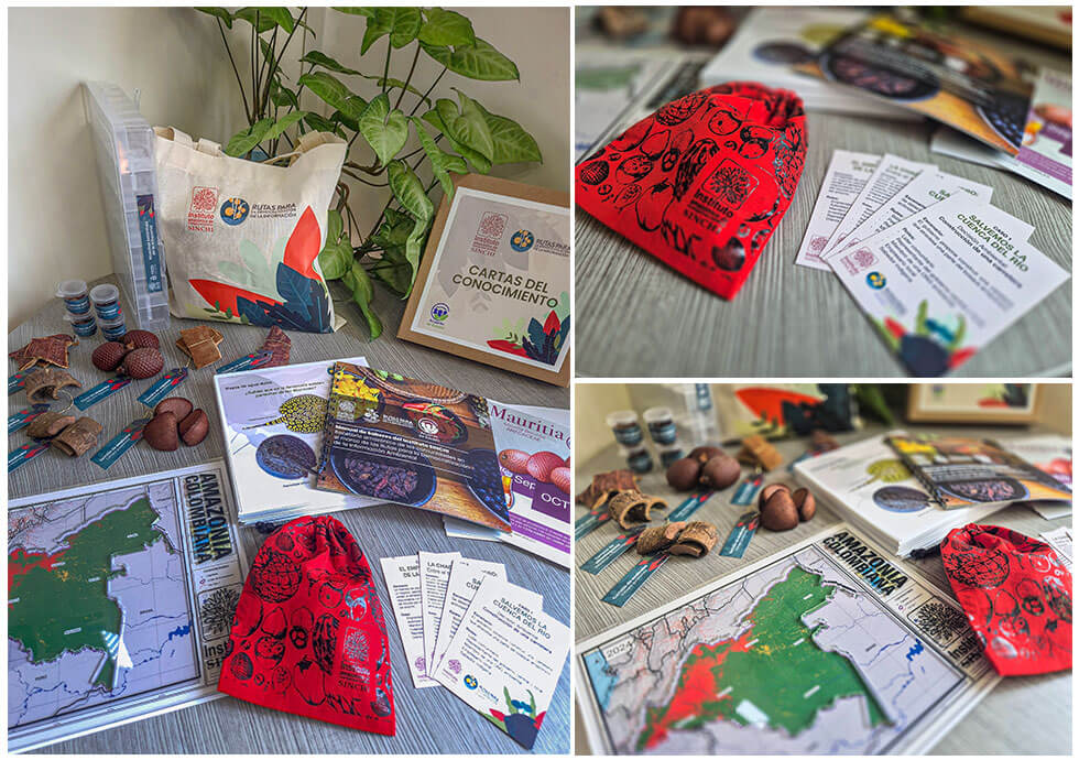 5. Muestras de frutos y cortezas Amazónicas: 1 Caja con semillas, frutos y cortezas secas representativas de la biodiversidad de la región, para la conexión sensorial y cultural con el territorio. (3 semillas de mauritia, 3 cáscaras de cacao, 3 semillas de andiroba, 1 corteza de chuchuguaza, 2 cortezas de andiroba, 2 cáscaras de copoazú, 1 corteza de achapo, semillas de asaí, fruto de asaí, semilla de cacao y semilla de copoazú).