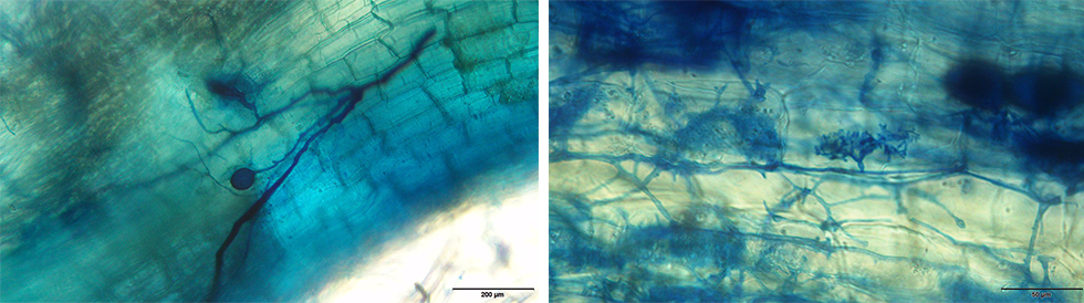 Figura 1. Hifas y arbustos de hongos micorrízicos arbusculares (HMA) dentro del tejido de una raíz, observados bajo microscopio óptico a escala. Escala a) 200 μm, b) 100 μm y c) 50 μm. Fotografías: Clara Patricia Peña Venegas