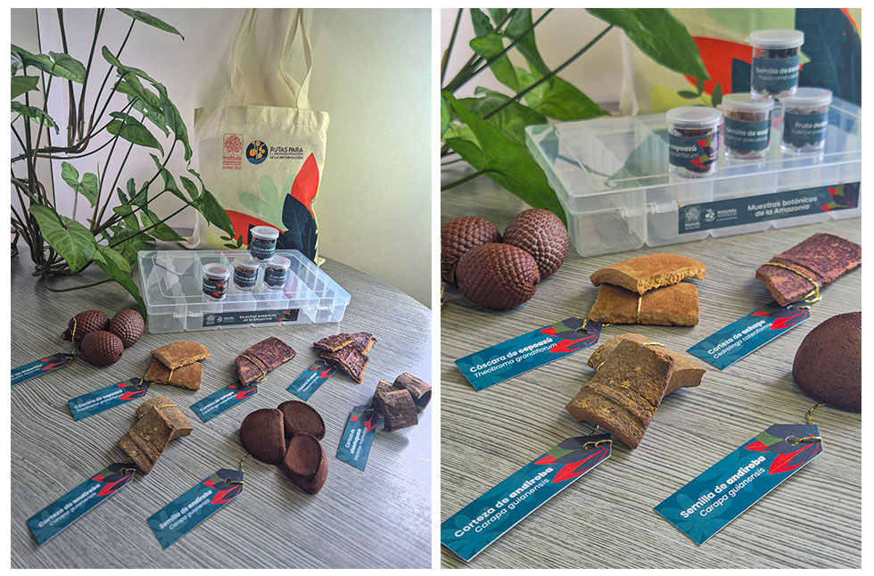 5. Muestras de frutos y cortezas Amazónicas: 1 Caja con semillas, frutos y cortezas secas representativas de la biodiversidad de la región, para la conexión sensorial y cultural con el territorio. (3 semillas de mauritia, 3 cáscaras de cacao, 3 semillas de andiroba, 1 corteza de chuchuguaza, 2 cortezas de andiroba, 2 cáscaras de copoazú, 1 corteza de achapo, semillas de asaí, fruto de asaí, semilla de cacao y semilla de copoazú).