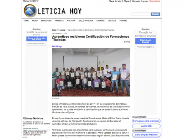 Leticia (Amazonas), 04 de diciembre de 2017.- En las instalaciones del instituto SINCHI se llevó a cabo, en la tarde del viernes, la ceremonia de Graduación de 40 aprendices, los cuales recibieron la certificación que los acredita como auxiliares, técnicos y tecnológicos.